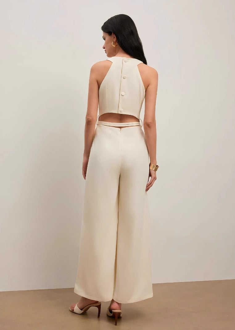 Imaginez une matinée ensoleillée, un rendez-vous important ou un dîner chic. Vous enfilez cette combinaison fluide, ajustez la ceinture, et tout est en place. Pas besoin de superflu, votre tenue parle pour vous. À la fois sobre et affirmée, elle incarne l’élégance sans compromis.