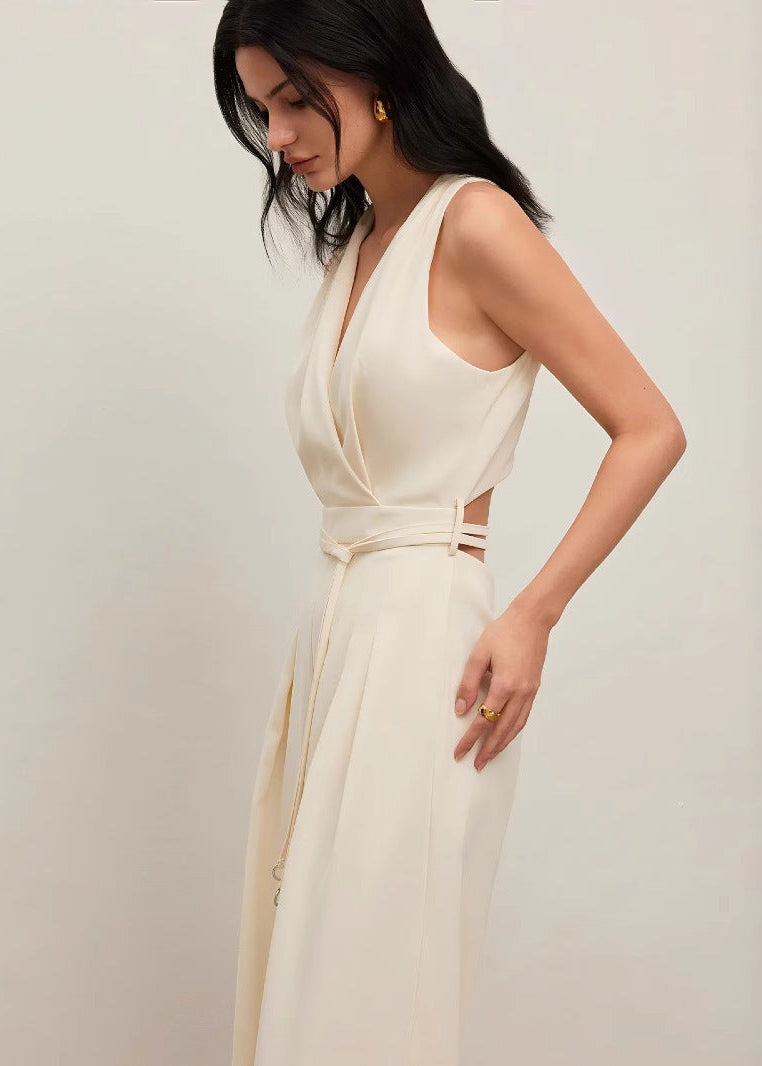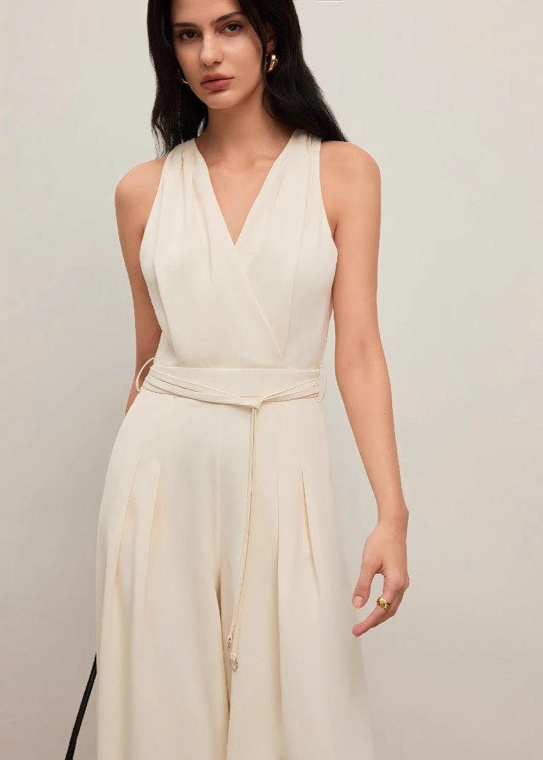 Optez pour une silhouette élancée et moderne avec cette combinaison sans manches à col en V, conçue dans une matière fluide et légèrement satinée. Sa coupe droite et son tissu doux en polyester de qualité offrent un tombé impeccable, parfait pour les journées professionnelles comme pour les occasions plus habillées. Le design minimaliste est subtilement rehaussé par une ceinture fine structurante (non incluse), qui souligne élégamment la taille sans effort.