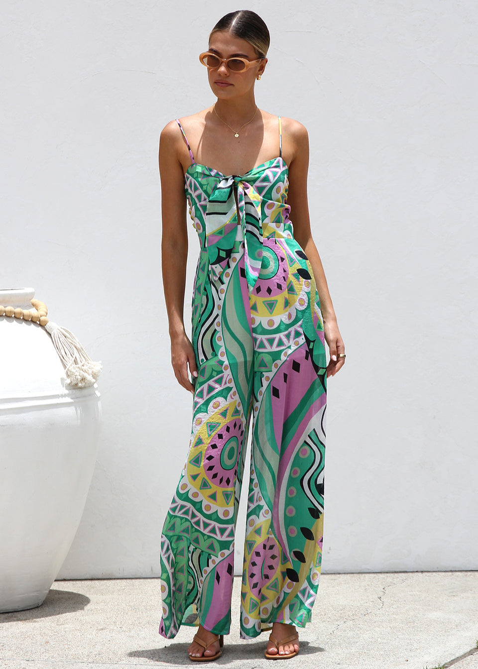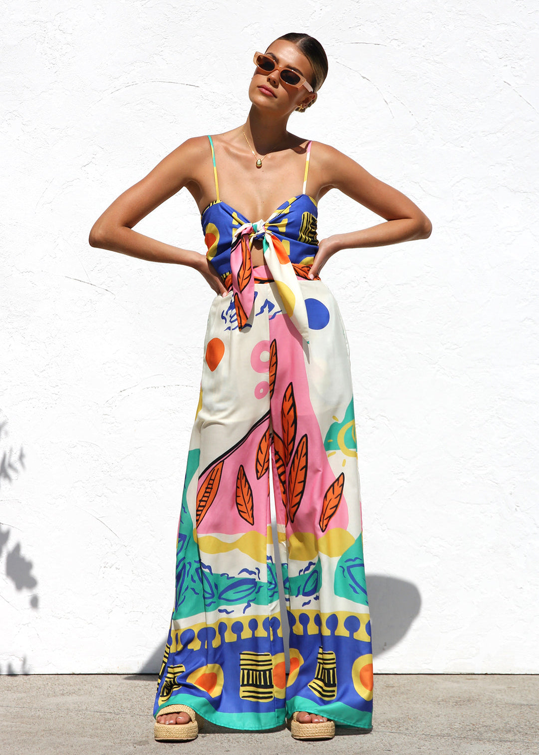 Ajoutez une touche d’audace à votre dressing estival avec cette combinaison fluide à imprimé multicolore, pensée pour celles qui osent se démarquer. Avec son nœud ajustable sur le buste, ses pantalons larges et sa coupe flatteuse, elle combine confort et caractère pour sublimer votre allure en un clin d'œil.