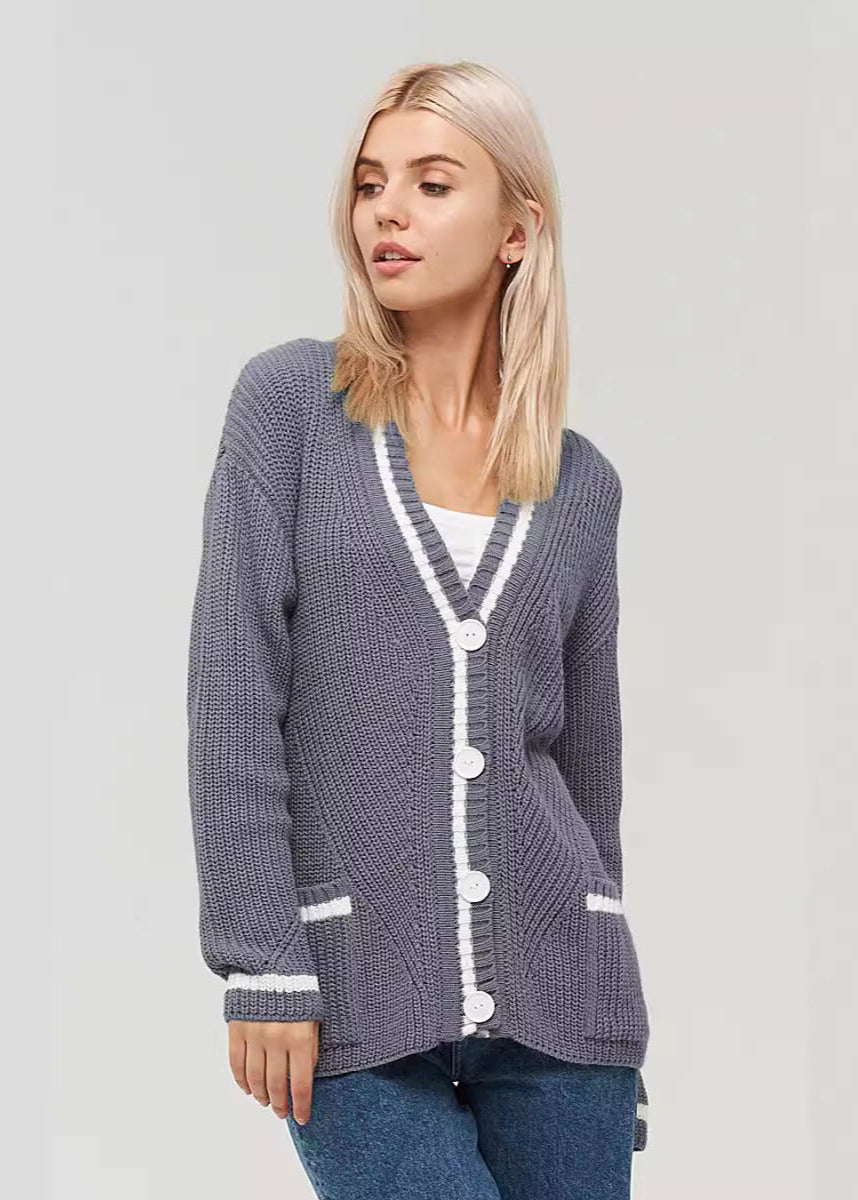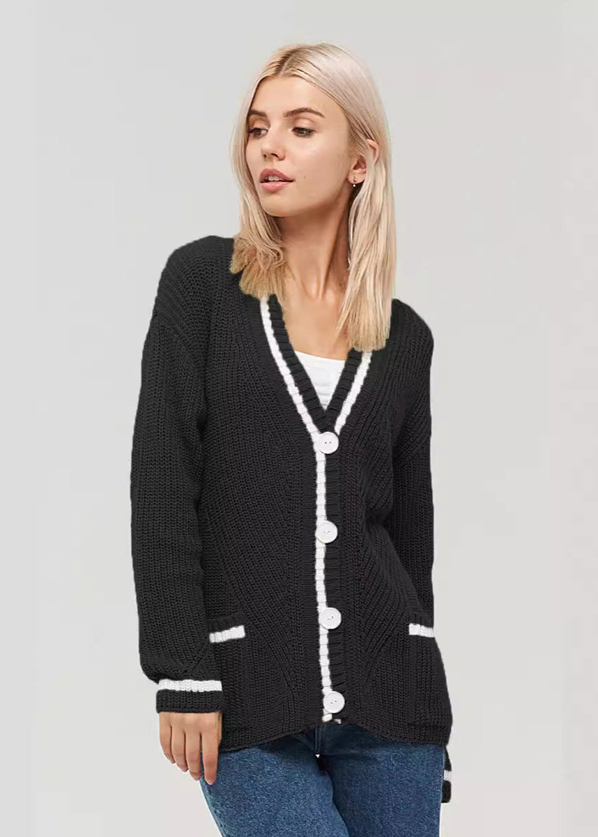 Ce gilet long à col V s’impose comme un incontournable de la garde-robe automne-hiver. Avec sa coupe droite, sa maille épaisse et ses détails contrastés blancs, il allie confort et style sans effort. Ce modèle est idéal pour celles qui recherchent une pièce chaude et facile à assortir, tout en gardant une touche d'élégance décontractée.