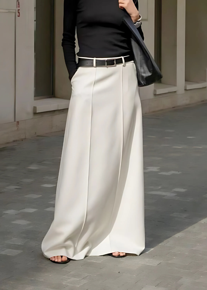 Cette jupe longue écrue pour femme incarne l’élégance moderne avec une touche de minimalisme. Conçue dans un tissu fluide à micro-élasticité, elle offre une tenue structurée sans compromettre le confort. Sa coupe droite légèrement ample, sa taille marquée par une ceinture et ses plis soignés lui donnent un look professionnel et raffiné, idéal pour le bureau, les rendez-vous ou les sorties en ville.