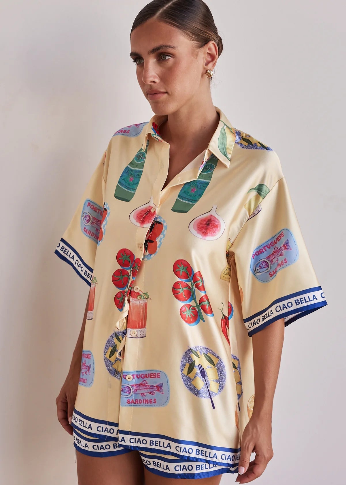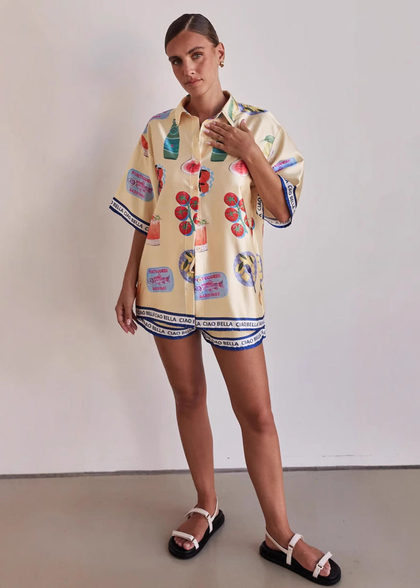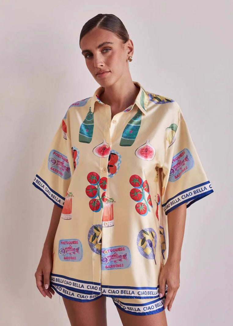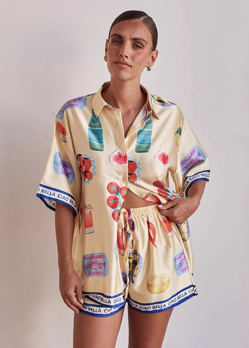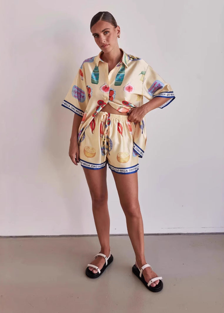Apportez une touche de fraîcheur et de fantaisie à vos journées à la maison avec cet ensemble homewear estival au motif cartoon. Conçu en polyester léger et respirant, il allie confort et style pour vos moments de détente, que ce soit pour lire, bruncher sur la terrasse ou simplement profiter d’une soirée relax. Le cardigan à manches courtes et col à revers s’associe parfaitement au short fluide, créant un look à la fois décontracté et soigné.