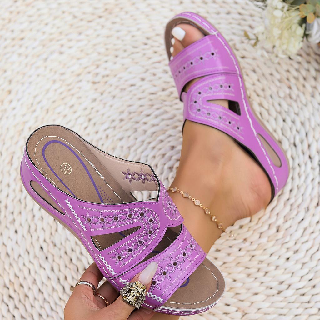Ces sandales allient élégance brodée et confort orthopédique grâce à leur semelle compensée légère. Elles offrent un soutien optimal du talon à la pointe, tout en restant respirantes et résistantes. Parfaites pour les longues journées, elles gardent vos pieds frais et stables à chaque pas.